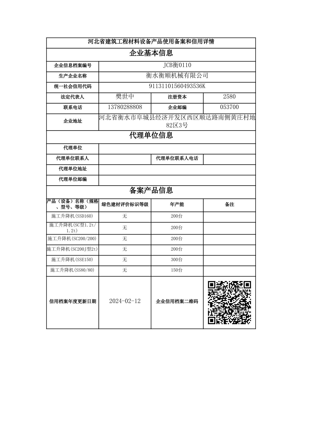 衡水衡順機(jī)械有限公司是生產(chǎn)SC200/200施工升降機(jī)、SC1.2t/1.2t施工升降機(jī)、SSE150施工升降機(jī)、SS80/80施工升降機(jī) 、施工升降機(jī)配件等建筑機(jī)械的廠家。